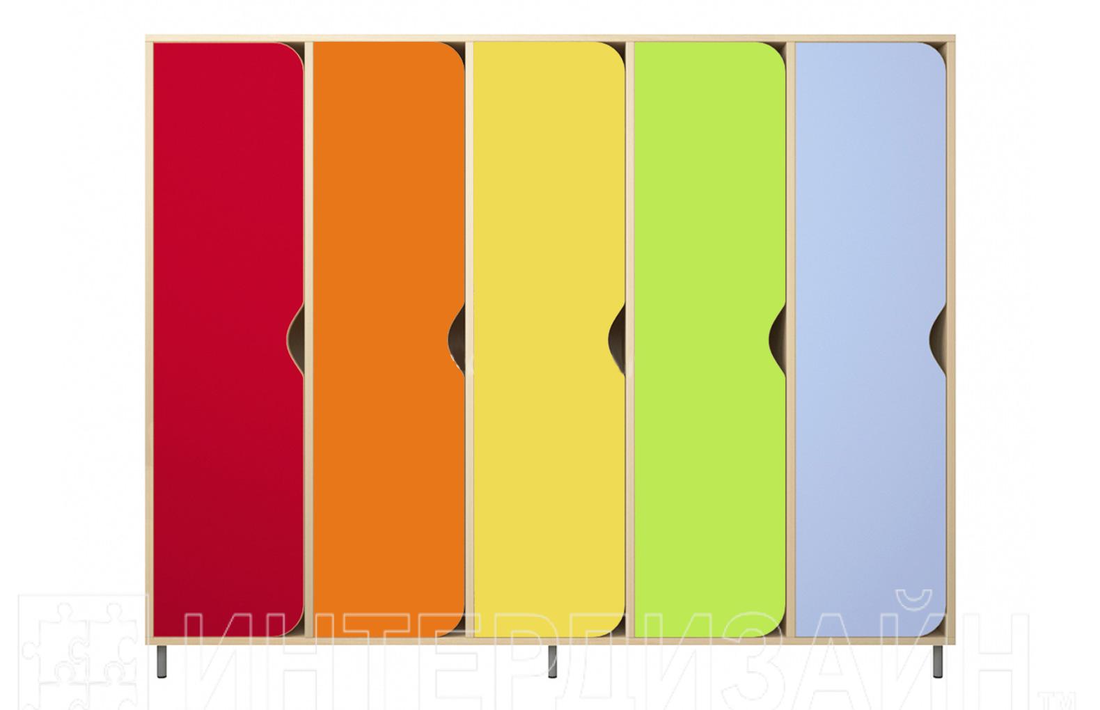 Шкаф для одежды детский пяти секционный предназначен для раздевалок дошкольных учреждений. Изготовлен из ЛДСП 16 мм ,все торцы обработаны кромкой ПВХ . Внутри оборудован полочкой для верхних головных уборов, двумя крючками для одежды. Стоит на закрепленных регулируемых хромированных опорах.Кромка фасада и корпус шкафа исполняется в цвете молочный дуб. Дверь шкафа имеет выемку для руки, что позволяет легко открывать дверь ребенку и исключает возможность травмироваться ручкой. Вся продукция сертифицирована.