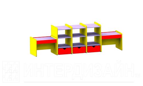 Название стеллажа говорит о том, что дети имеют возможность подойти к нему с любой стороны и играть, это очень удобно. Стеллаж имеет три выдвижных ящика, полки, а крайние тумбы в виде столов можно использовать для настольных игр.