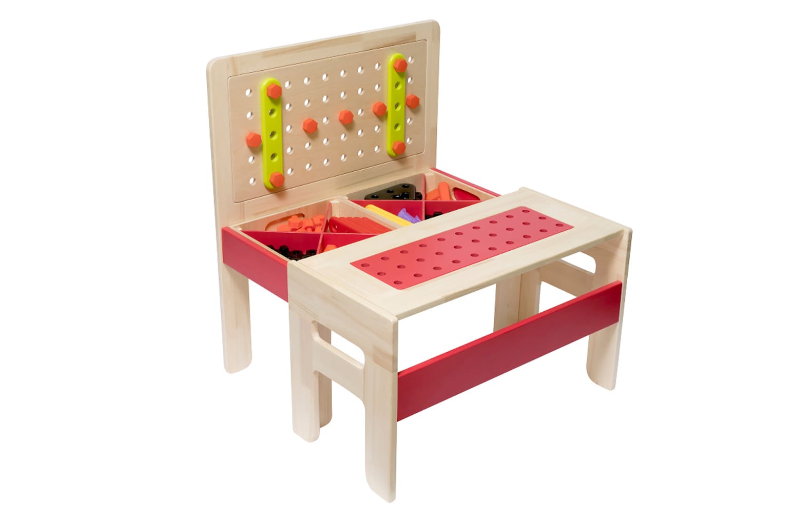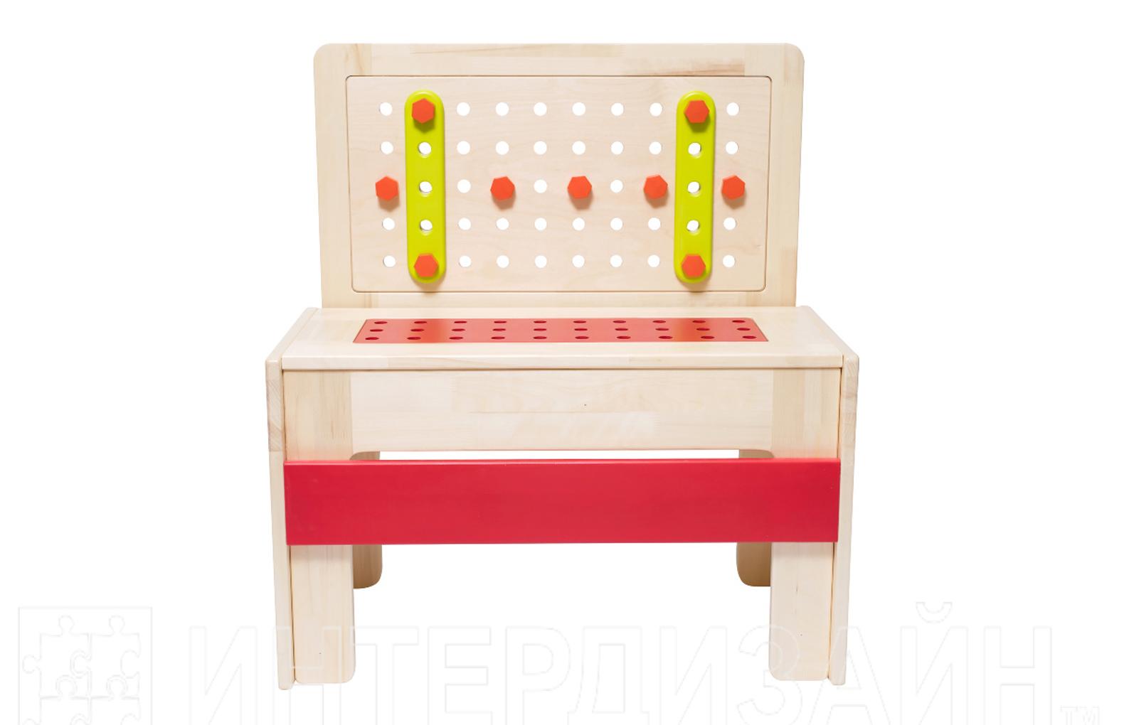 Многофункциональный игровой модуль для оснащения средних и старших групп ДОО. Изделие представляет собой стилизованный стол-верстак с невысокой стенкой и выдвижной частью. На стенке находится множество отверстий, на которые можно крепить с помощью саморезов разноцветные фигуры и слесарный инструмент. Выдвижная часть так же содержит отверстия, в разложенном виде она открывает доступ к небольшим ящикам для хранения. В комплекте к игровому модулю идут слесарные инструменты и комплектующие: планка большая-2, планка средняя-5, планка малая-5, гайка-59, кронштейн-4, молоток-2, ключ гаечный-1, ключ раздвижной-1, болт большой-10, болт малый-24. Все элементы выполнены из натурального древесного полотна, частично окрашены. Занятия со столярным уголком способствуют развитию мелкой моторики, усидчивости, социально-личностному и трудовому воспитанию дошкольников.