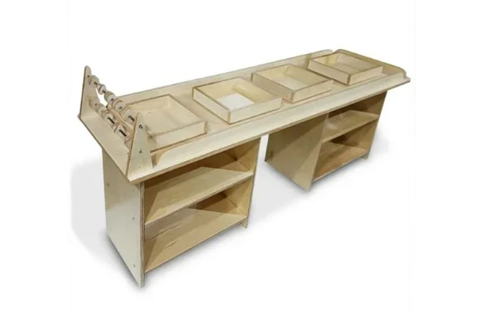 На столешнице расположено 4 встроенных ящика для хранения разных предметов. Слева находятся счёты: на металлическом стержне нанизаны деревянные геометрические фигуры.