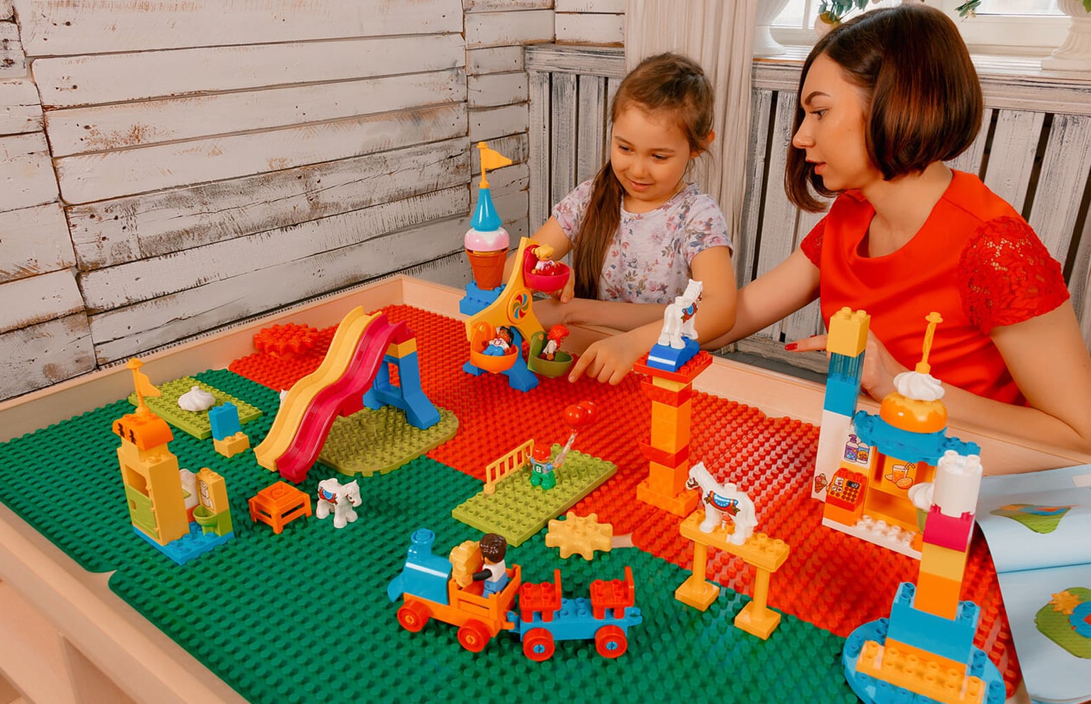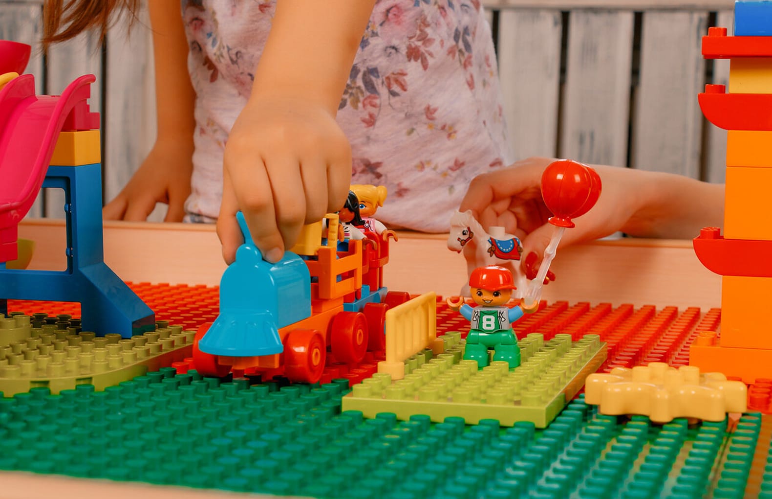 Детали LEGO Duplo или аналог. В комплекте есть транспорт, домики, красивые деревья, животные и фигурки людей, благодаря которым малыши могут моделировать различные ситуации.