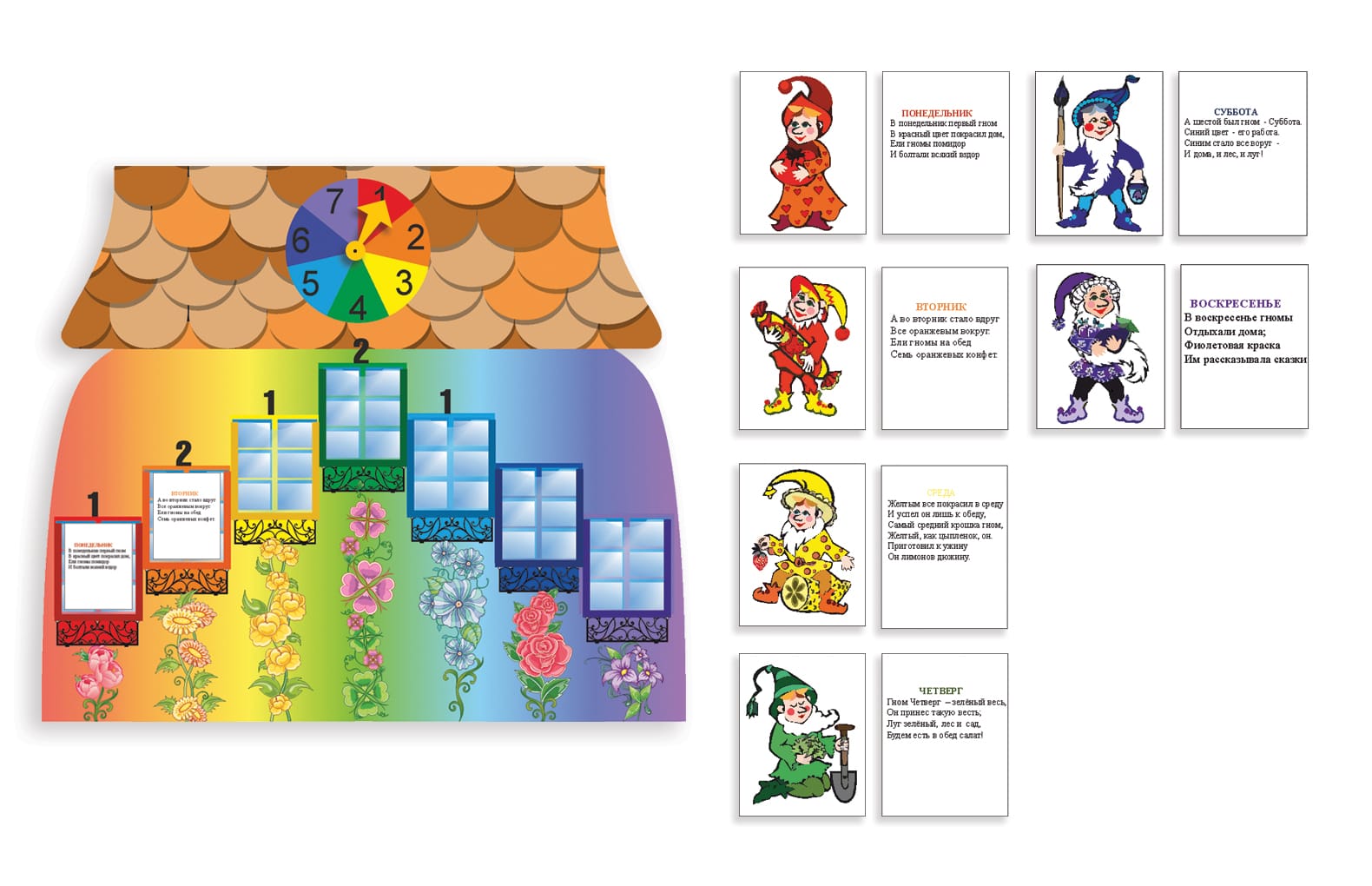Красочные образы цветных гномиков и веселые тематические стишки помогают малышам быстрее усвоить эти базовые темы.