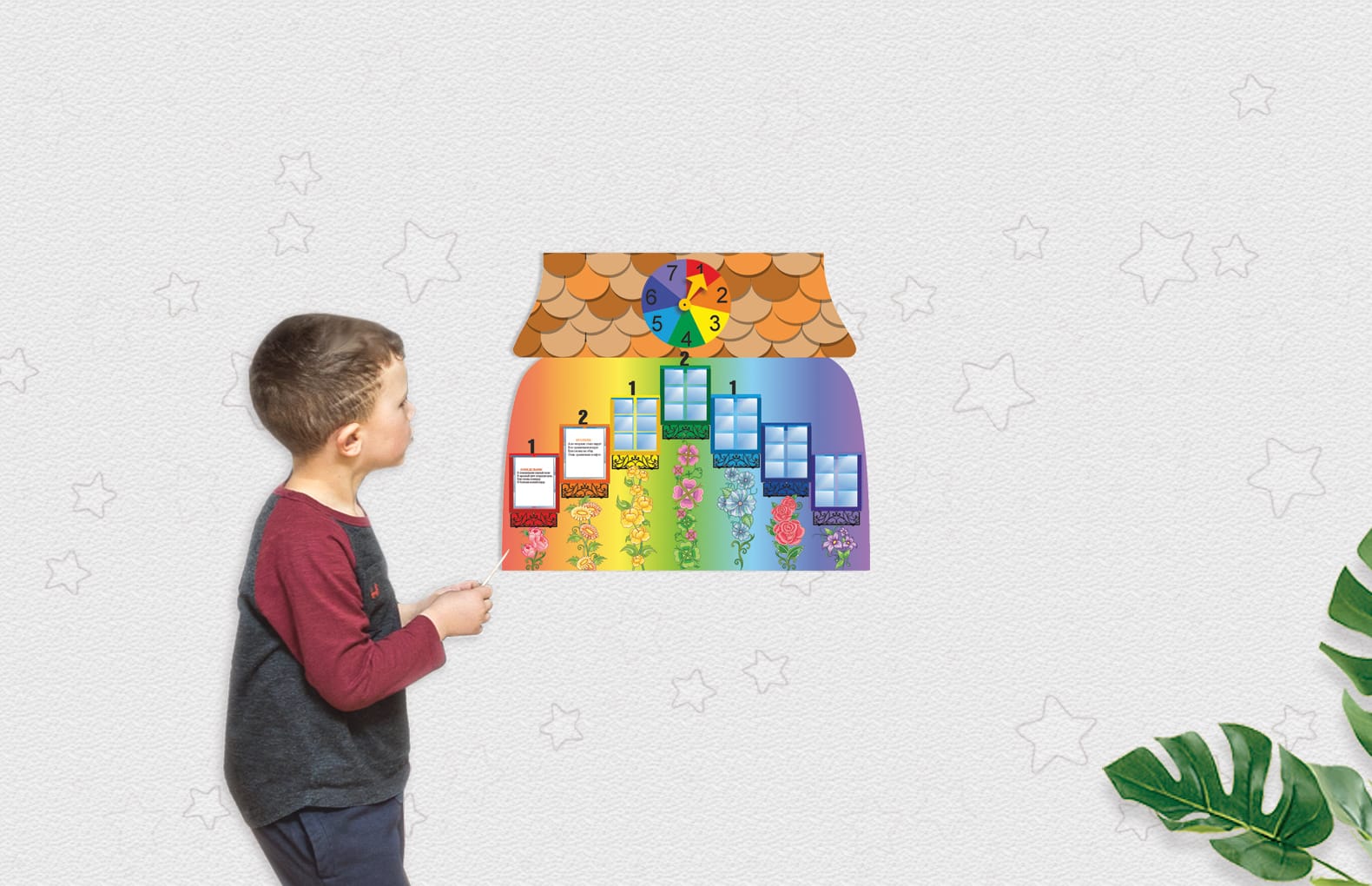 В комплектеСтенд Домик дней недели, 7 двусторонних карточек дни недели, фурнитура для крепления.