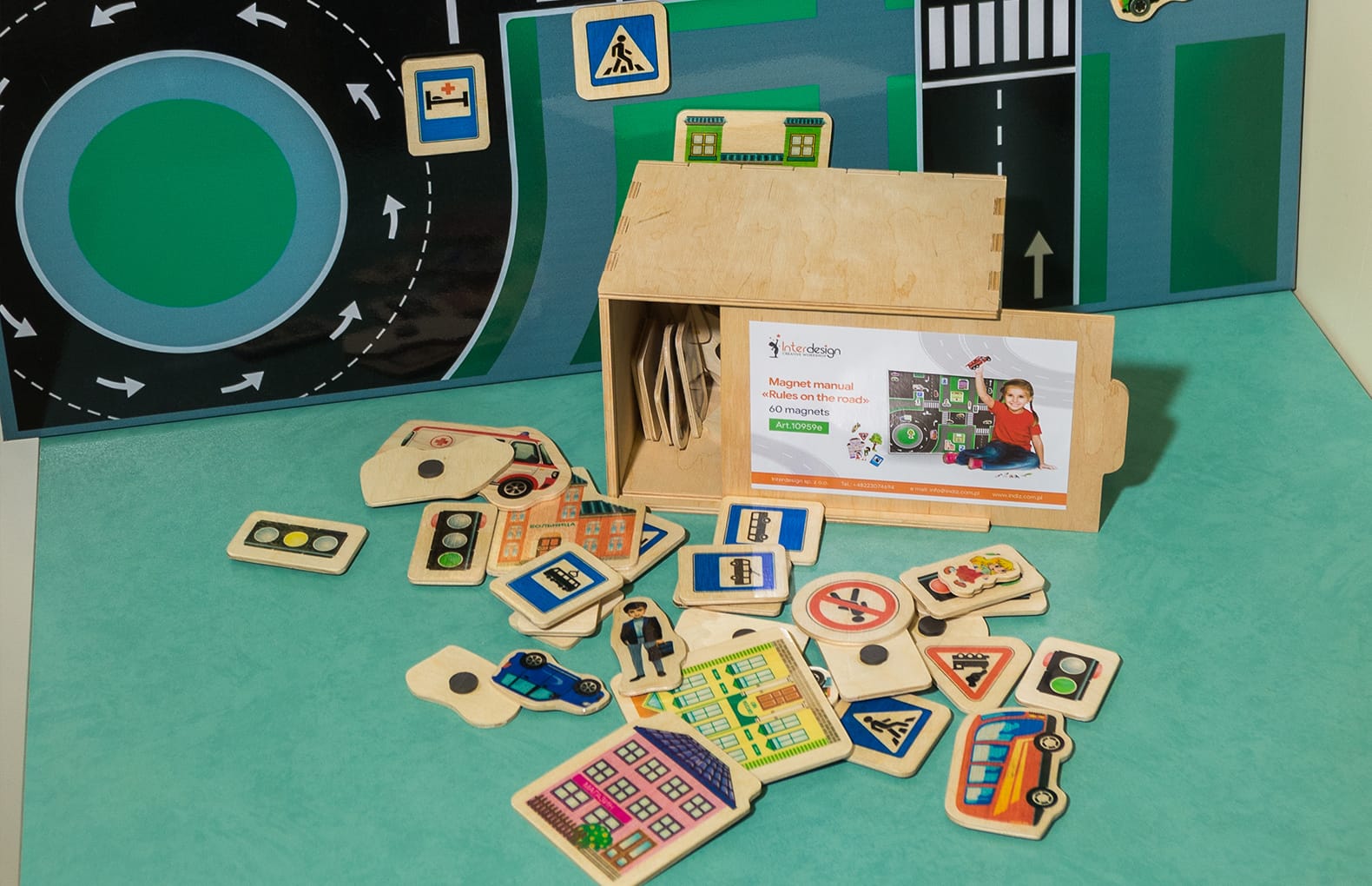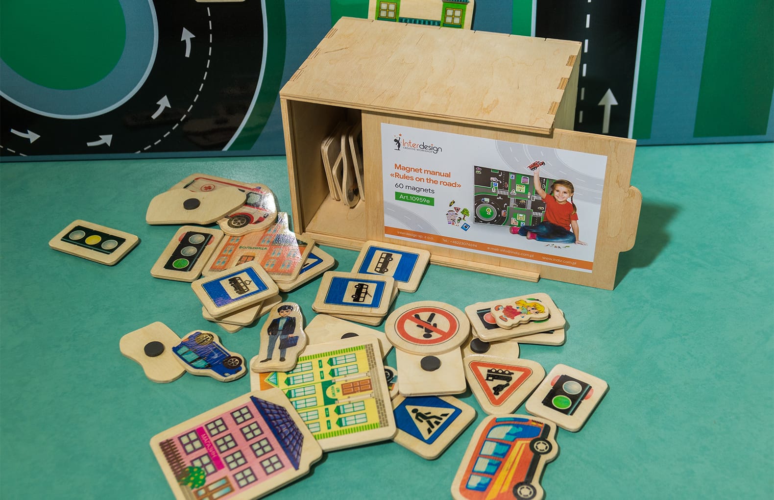 В комплекте60 элементов для изучения ПДД, коробка из фанеры