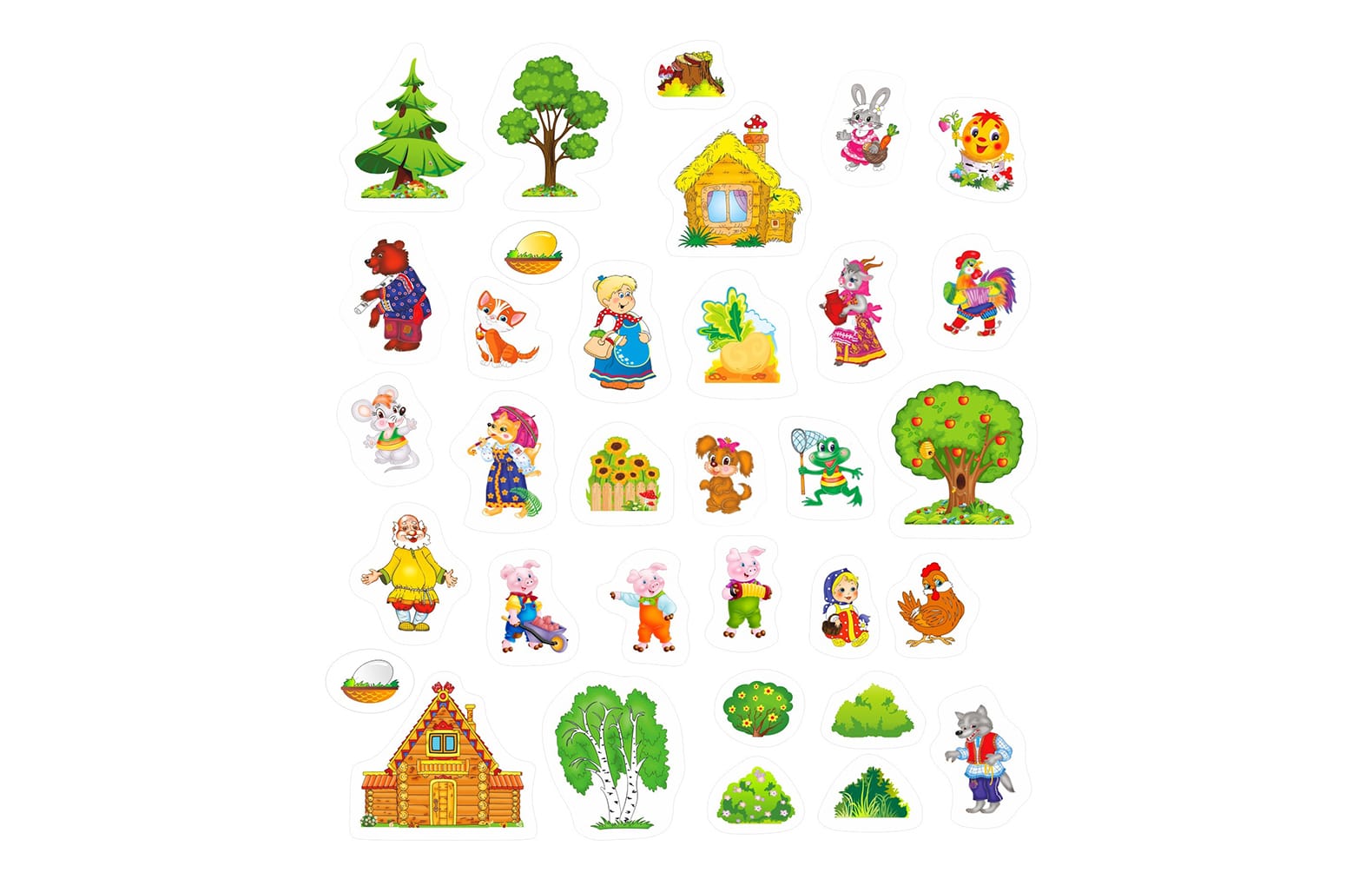 Комплект магнитов предназначен для постановки спектаклей по мотивам русских народных сказок прямо в группе ДОУ. С помощью красочных магнитов Вы можете вместе с детками выучить 10 сказок. Такие игры помогают ребенку успешно развивать речь, воображение, память, мышление, артистизм, осваивать ролевые игры и умение следить за сюжетом.