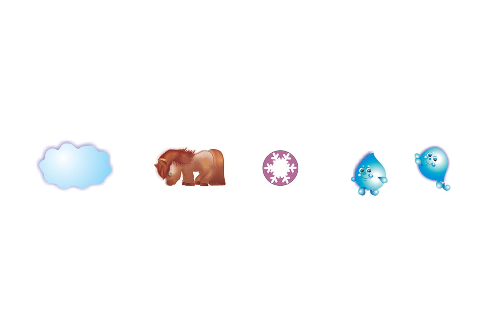 В ключевых моментах (переход воды в разные состояния) на стенде закреплены пластинки под магнит, для того, чтобы воспитатель мог перемещать капельку-путешественницу. Ну а так как во время путешествия капелька принимает различные формы, к стенду прилагаются магнитные фигурки - взлетающая и падающая капельки, облачко и снежинка. А еще - магнитная лошадка, которую в начале урока учитель поставит на стенд и дети, закрепляя материал, смогут ей рассказывать о том, что происходило с капелькой воды.