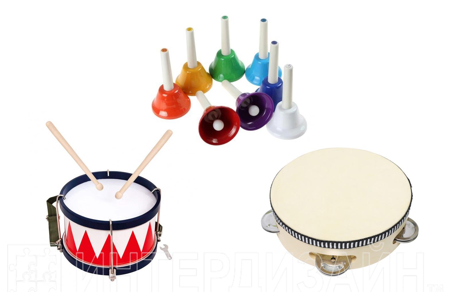 Состав: 1. Барабан двусторонний детский с кожаной мембраной. Диаметр барабана 22 см. В комплекте 2 деревянные палочки. Материал: дерево, кожа-1 шт. 2. Комплект колокольчиков музыкальных 8 нот (от С1 до С2). Каждый из восьми колокольчиков настроен на определенную ноту, а также имеет свой цвет и обозначение ноты на ручке. Данный игровой материал подходит не только для занятий на развитие музыкального слуха, но и для изучения нотной грамоты. Колокольчики также рекомендованы как инструмент для самостоятельных творческих занятий в игровой ДОО, они обладают приятным мелодичным звучанием. Размер одного колокольчика: высота 13 см, диаметр 7 см. Материал: металл, пластмасса, набор (8 шт), 4. Бубен детский диаметром 15 см. Изделие выполнено из натурального дерева и кожи, имеет 4 пары металлических тарелочек, которые издают приятный не резкий звук.-4 шт.