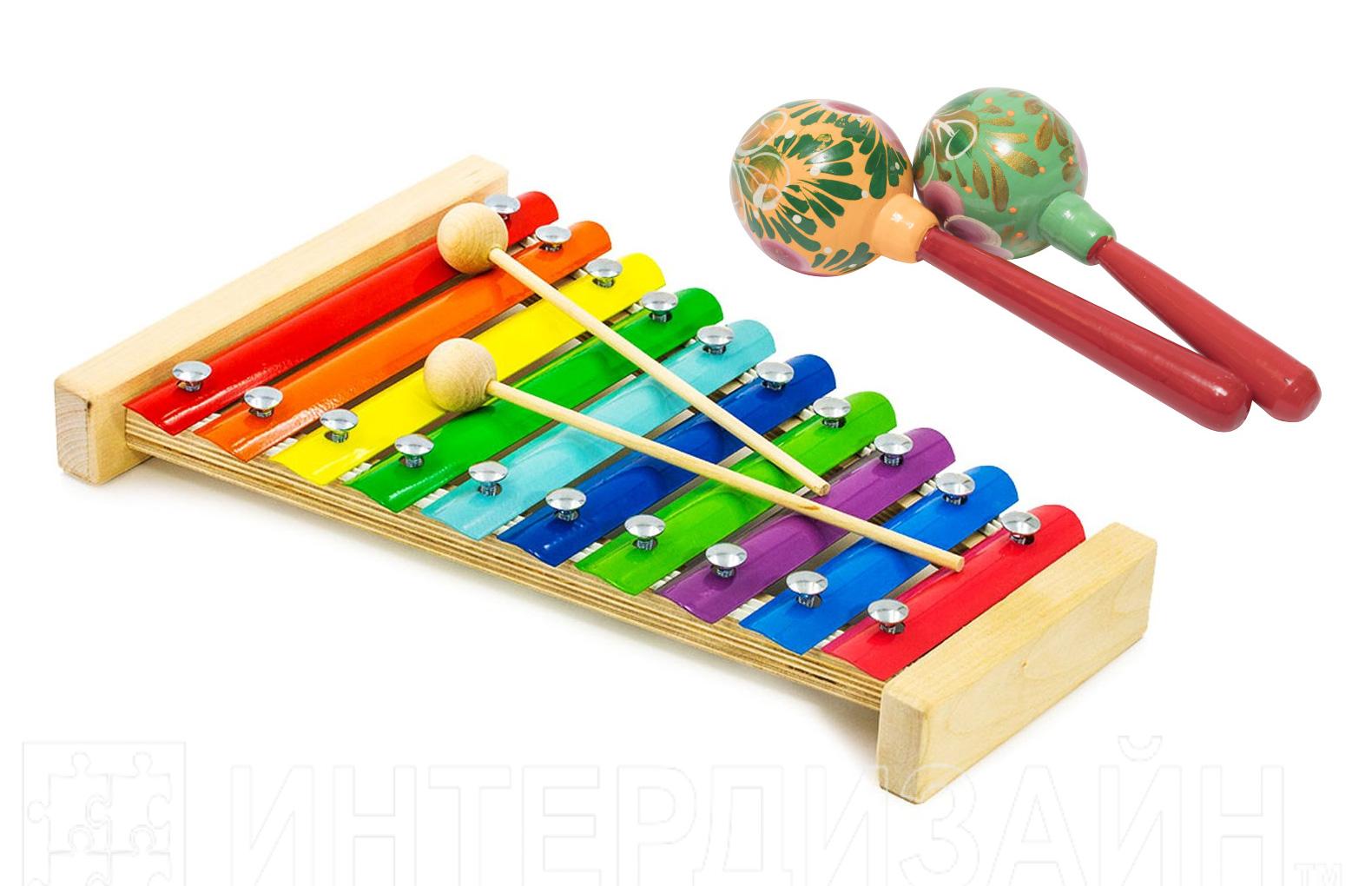 Состав: 1. Маракас – шумовой музыкальный инструмент длиной 18 см выполнен из натурального дерева и украшен разноцветной росписью в русском народном стиле. Маракасы обладают приятным звучанием и помогают воспитанникам развивать чувство ритма и учиться его воспроизведению-10 шт, 2. Металлофон имеет 10 металлических пластинок разной длины, настроенных на определенные ноты. Цветные элементы располагаются горизонтально вдоль всего деревянного корпуса. Каждый тон имеет свой цвет. Длина корпуса металлофона: 34 см. В комплекте 2 деревянные палочки. Материал: металл, дерево -1 шт