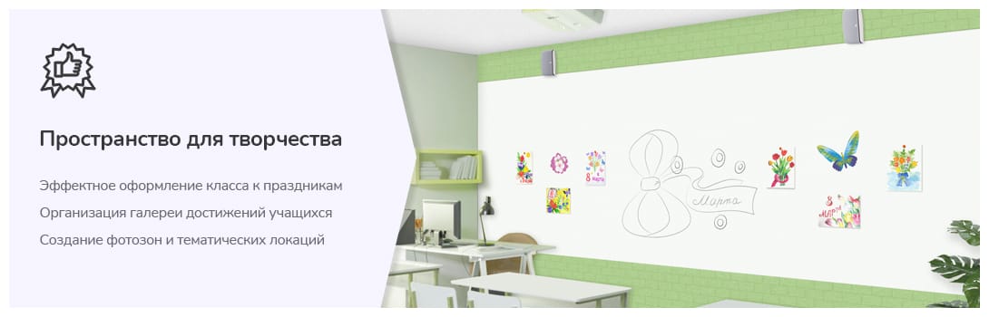 Основная ценность данного решения - большая магнитно-маркерная поверхность, практически неограниченное пространство для творчества и размещения полезной информации.