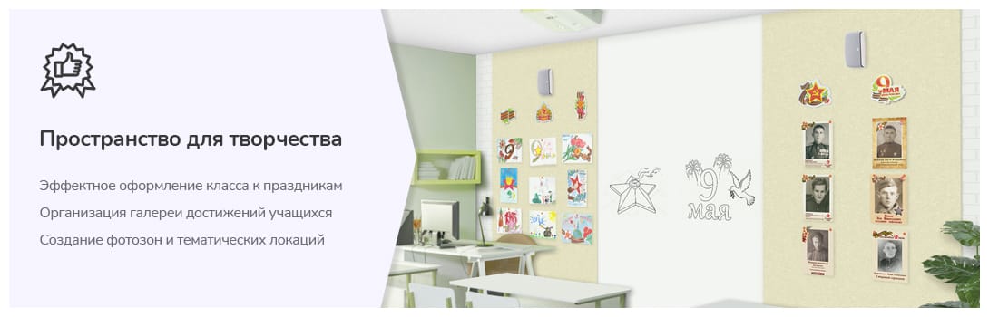 тива пробковой доске, но и эффективная шумоизоляция и защита от холодных стен. Обратите внимание на то, что и войлочная, и магнитно-маркерная поверхность функциональна от пола до потолка, то есть Вы можете задействовать все пространство, например, создавая фотозоны к празднику или размещая тематические галереи работ учащихся. Это представляет массу возможностей для реализации различных творческих идей, эффектного оформления класса к праздникам, создания фотозон, тематических экспозиций.