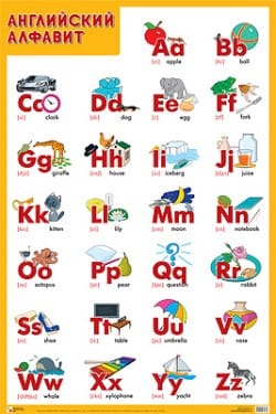 C помощью плаката ребенок сможет сделать первые шаги в изучении английского языка: выучить алфавит, познакомиться с произношением английских букв внутри слов, запомнить первые слова на иностранном языке. Рядом с каждой буквой изображены предметы, в названии которых данная буква является первой, что служит подсказкой для ребенка и помогает получать знания в игровой форме.