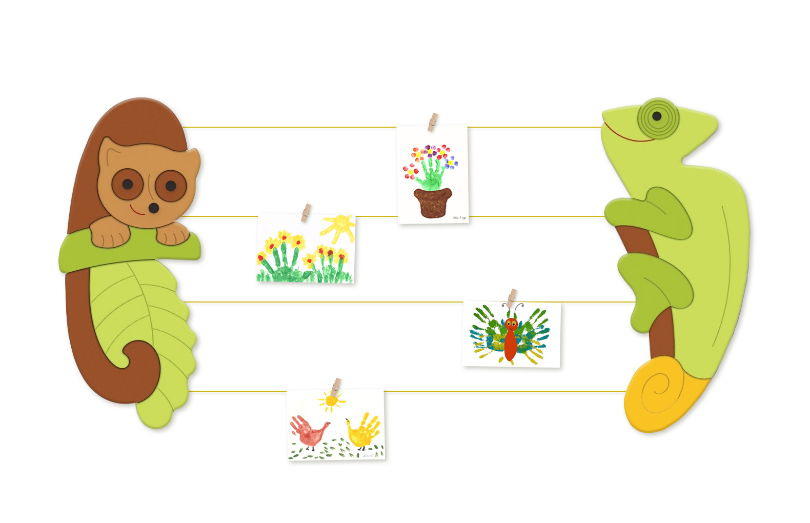 Рисунки и информация крепятся на элементы с помощью декоративных прищепок.