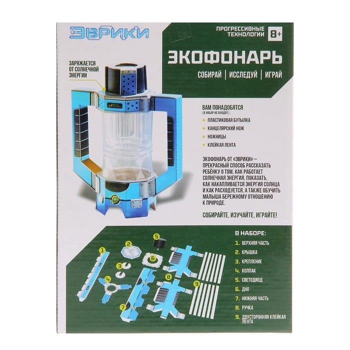 Набор для опытов Экофонарь Сконструируйте экофонарь и проведите эксперимент. Устройство работает от солнечной энергии. В комплектацию входит: инструкция на русском языке верхняя часть крышка крепление колпак светодиод дно нижняя часть ручка двусторонняя клейкая лента.