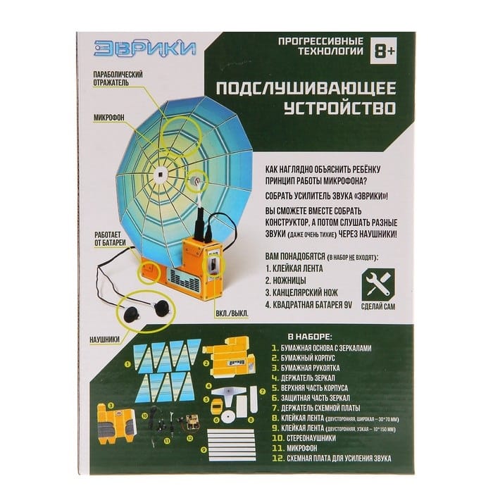 Набор для опытов Подслушивающее устройство, работает от батареек Сконструируйте подслушивающее устройство и проведите эксперимент. Прибор усиливает даже самые тихие звуки. В комплектацию входит: инструкция на русском языке бумажная основа с зеркалами корпус рукоятка держатель зеркал верхняя часть корпуса защитная часть зеркал держатель схемной платы двухсторонняя клейкая лента стереонаушники микрофон схемная плата для усиления звука. Дополнительно потребуется: односторонняя клейкая лента ножницы канцелярский нож квадратная батарейка 9В.