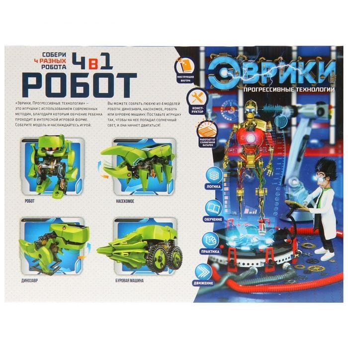 Набор для опытов Робот, 4 в 1 Представляем вашему вниманию занимательный набор для опытов «Робот» серии «Эврики: Прогрессивные технологии». Соберите любую из 4 моделей — динозавра, насекомое, робота или буровую машину — и наслаждайтесь игрой! В чём особенность? Из одних и тех же деталей можно собрать 4 комбинации. Каждая модель имеет способность двигаться, и при этом батарейки ей не нужны. Робот активизируется с помощью солнечной батареи. Поставьте игрушку так, чтобы на неё падал солнечный свет, и она оживёт! Неоспоримое преимущество! Альтернативные источники энергии — это то, что ждёт нас в недалеком будущем. Поэтому именно сейчас идеальное время рассказать ребёнку о новых источниках энергии, которые не вредят окружающей среде. Играя с таким конструктором, он научится создавать, что-то новое, набор будет способствовать развитию воображения, мышления и логики. В наборе вы найдёте: двигатель с солнечной батареей ведущую шестерню жёлтую шестерню оранжевую шестерню круглый вал шестерню с короткой осью шестерню с длинной осью губку пластиковые детали.