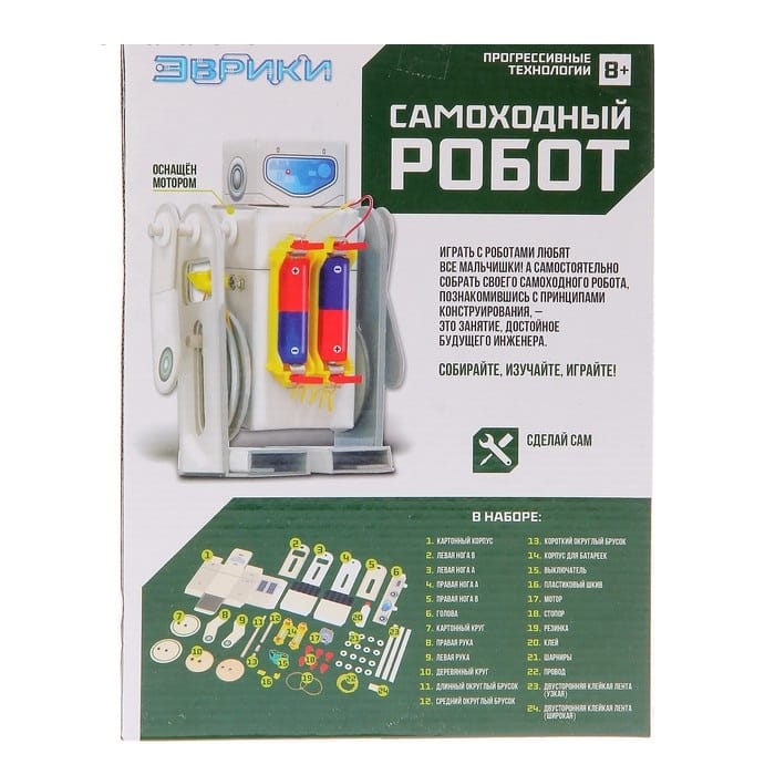 Набор для опытов Самоходный робот, работает от батареек Сконструируйте самоходного робота и проведите эксперимент. Чтобы устройство двигалось, достаточно вставить батарейки. В комплектацию входит: инструкция на русском языке картонный корпус комплект ног, 4 шт. голова картонный круг деревянный круг руки, 2 шт. набор округлых брусков выключатель пластиковый шкив мотор стопор резинка клей шарниры провод двухсторонняя клейкая лента корпус для батареек. Дополнительно потребуются 2 батарейки типа АА.