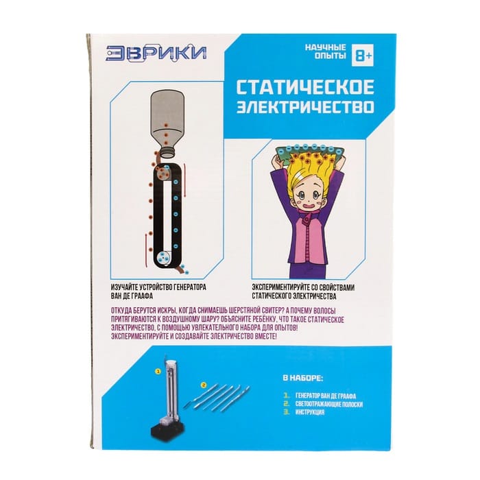 Набор для опытов Статическое электричество С набором торговой марки «Эврики» ребёнок изучит движение отрицательно заряженных частиц, проведёт опыты с компактным генератором Ван де Граафа и узнает, как получить статическое электричество с помощью алюминиевой банки.