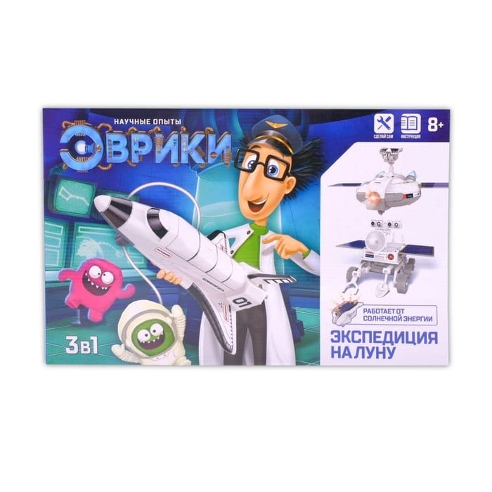 Научные опыты Экспедиция на Луну, 3 в 1 С набором торговой марки «Эврики» ребёнок сконструирует космическую станцию, шаттл или луноход и приведёт модель в действие с помощью солнечной батареи.