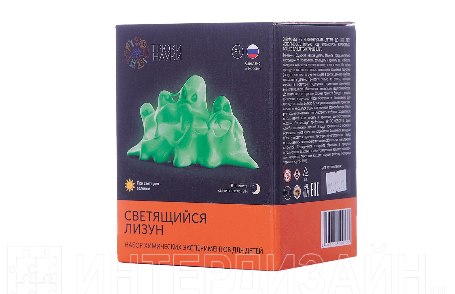 "Светящийся лизун" при свете дня - белый , в темноте светится бирюзовым. Реагентов хватает на несколько исполнений.