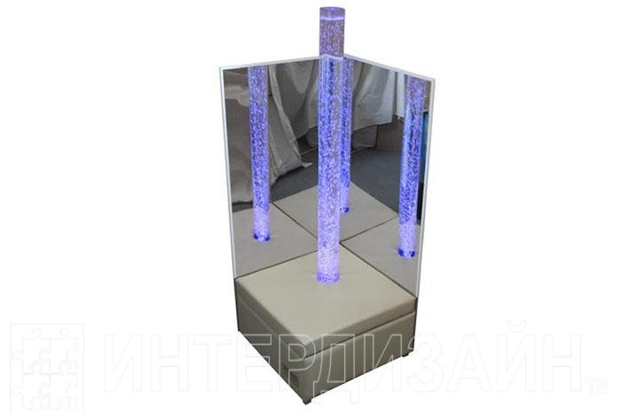 Трубка(Н-1500, D-100) Основание(500х500х250) В прозрачной колонне из прочного пластика, заполненной дистиллированной водой, поднимается бесконечное число воздушных пузырьков. Если в колонну запустить пластмассовых рыбок или шарики, то они начинают резвиться, подталкиваемые пузырьками воздуха. Они то всплывают вверх, в цветных, переливающихся струях, то падают вниз. Это завораживающее зрелище не оставит равнодушными ни детей ни взрослых. Если прижаться к трубке, можно ощутить вибрацию.Для создания мягкого, удобного сиденья, пузырьковая колонна оснащается Мягкой платформой. А безопасное угловое акриловое зеркало создает неповторимый оптический эффект расширения пространства.