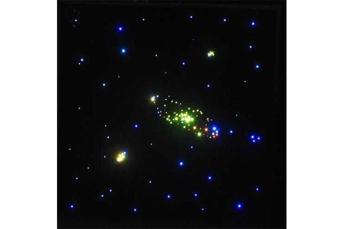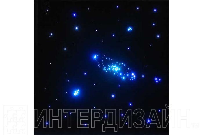 Настенная конструкция с мерцающими звездами и изображением галактики. Использованы 140 оптоволоконных нитей торцевого свечения разных диаметров. Электронная плата управления светодиодными источниками в комплекте, прилагается сетевой адаптер.