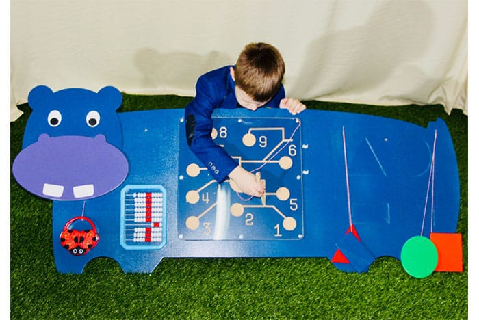 Развивающая панель ""Бегемот"" имеет небольшие счеты, магнитный лабиринт и формы сортировки фигур.