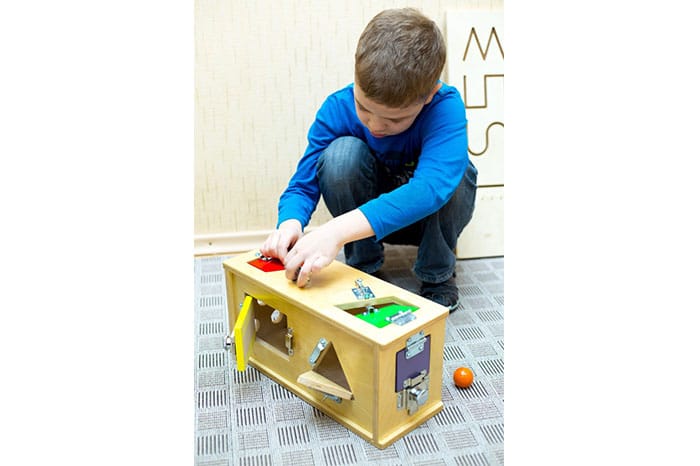 Сундучок предназначен для развития мелкой моторик, мышления, изучения цветов, а так же подходит для изучения геометрических форм.