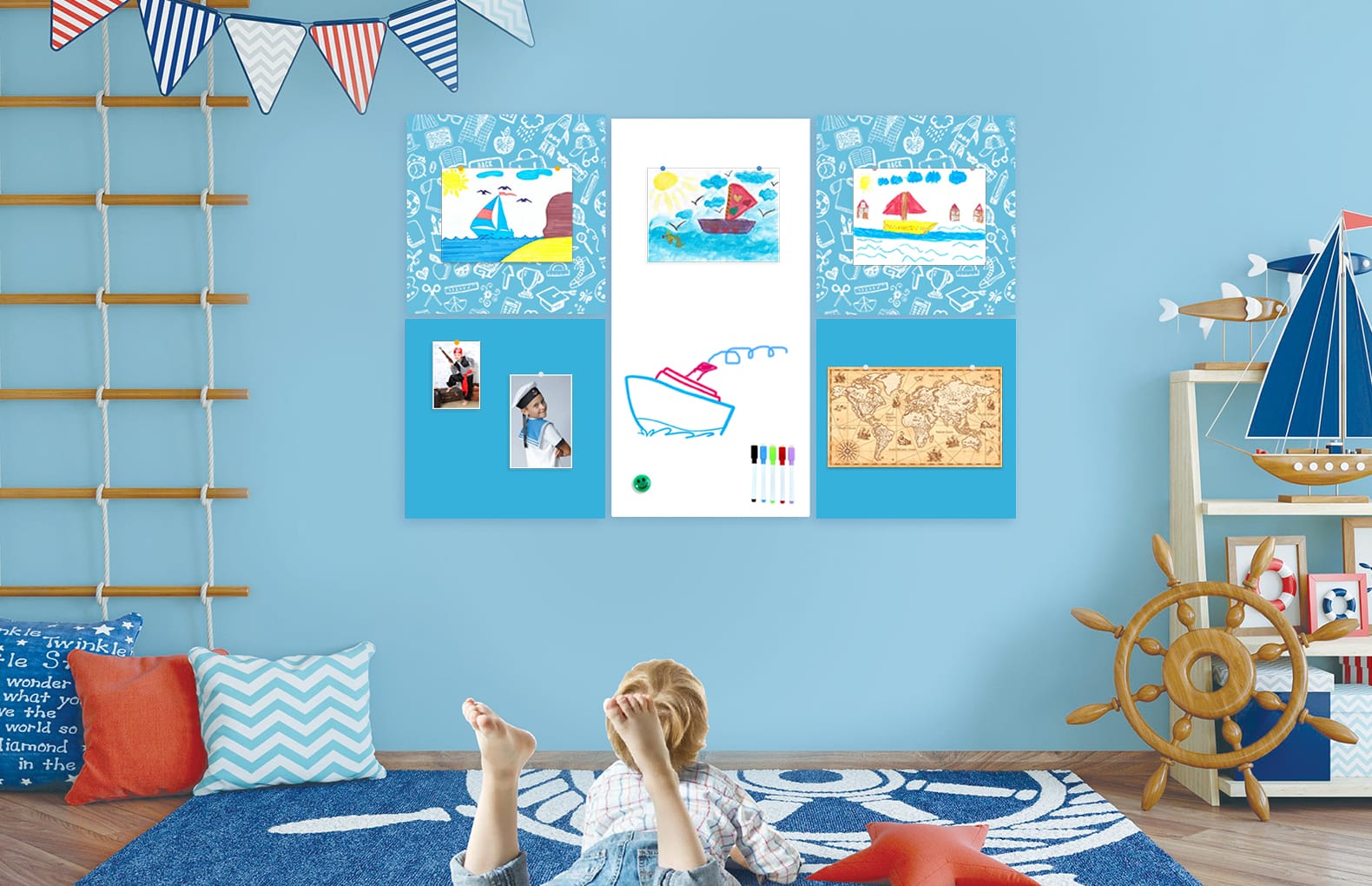 Размеркомпозиции - 160х105 см, магнитно-маркерная белая панель - 100х50 см, магнитная панель голубая - 50х50 см, магнитная панель с принтом Boy - 50х50 см