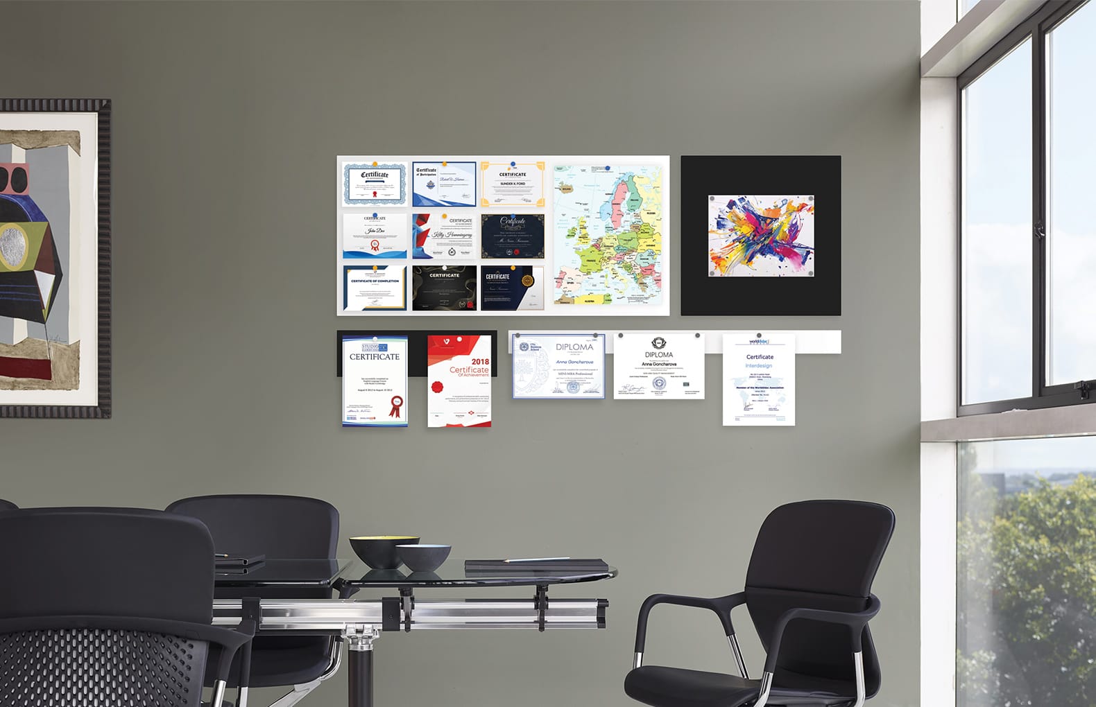 Вы можете комбинировать цветные панели или размещать их в интерьере с белыми магнитно-маркерными панелями. Такие комбинации задают стиль помещению, придают ему определенный характер.