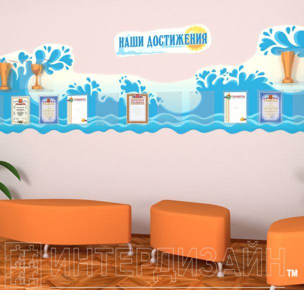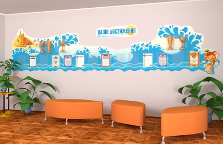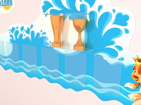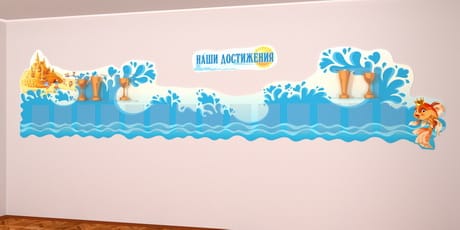 К таким элементам относятся крепкие акриловые полочки и карманы на дистанционных держателях, куда школа или детский сад может поместить грамоты, кубки, медали и прочую атрибутику которую завоевала или завоюет в будущем ваша школа.