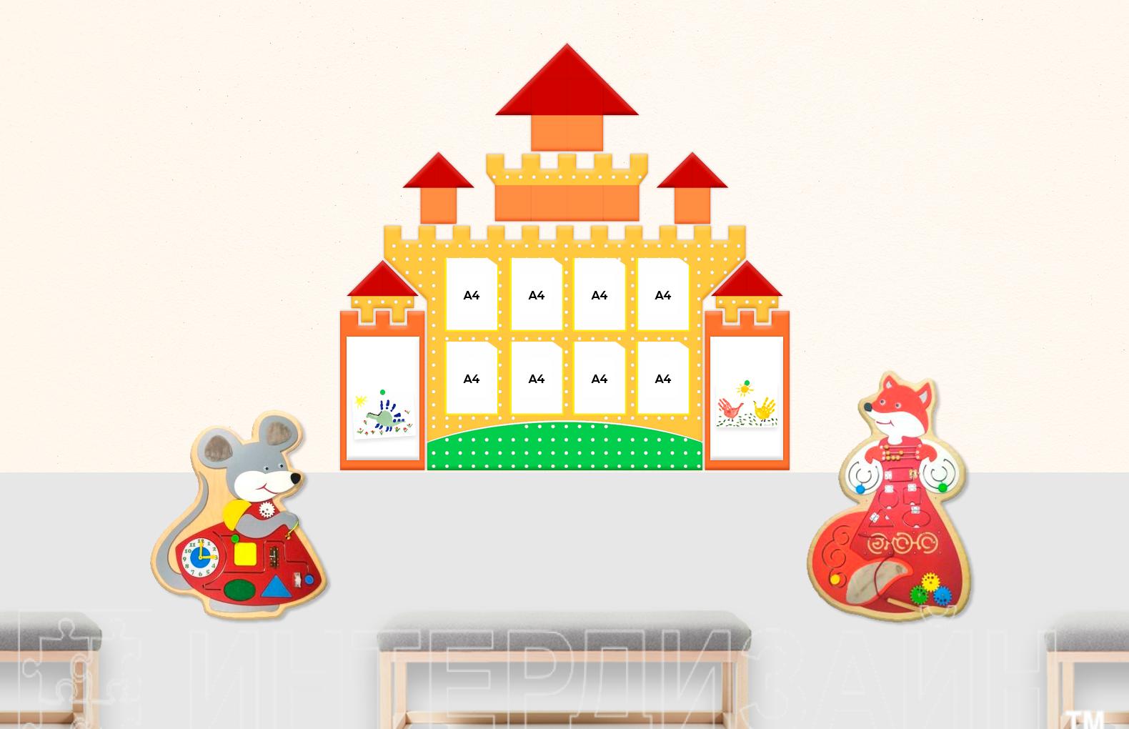 Комплектация: Замок с магнитными панелями и карманами А4 186х177см, карманы А4 - 8шт., магнитные панели 30х50 см - 2 шт., бизиборд "Мышка-норушка" 56х71см, бизиборд "Лиса" 49х78 см