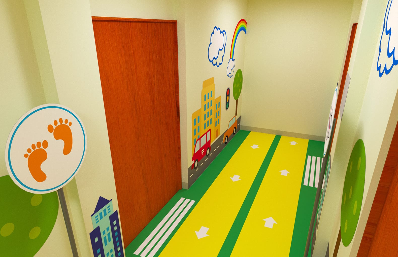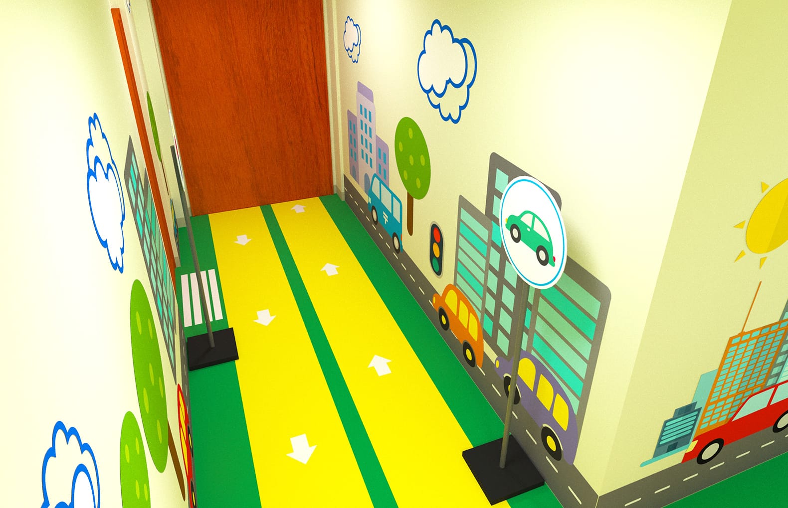 Вы можете заказать готовые дизайн решения (как представлено на фото) на тему дорожного движения, природы, животного мира, морской тематики, оформление с элементами обучения счету и т.д.