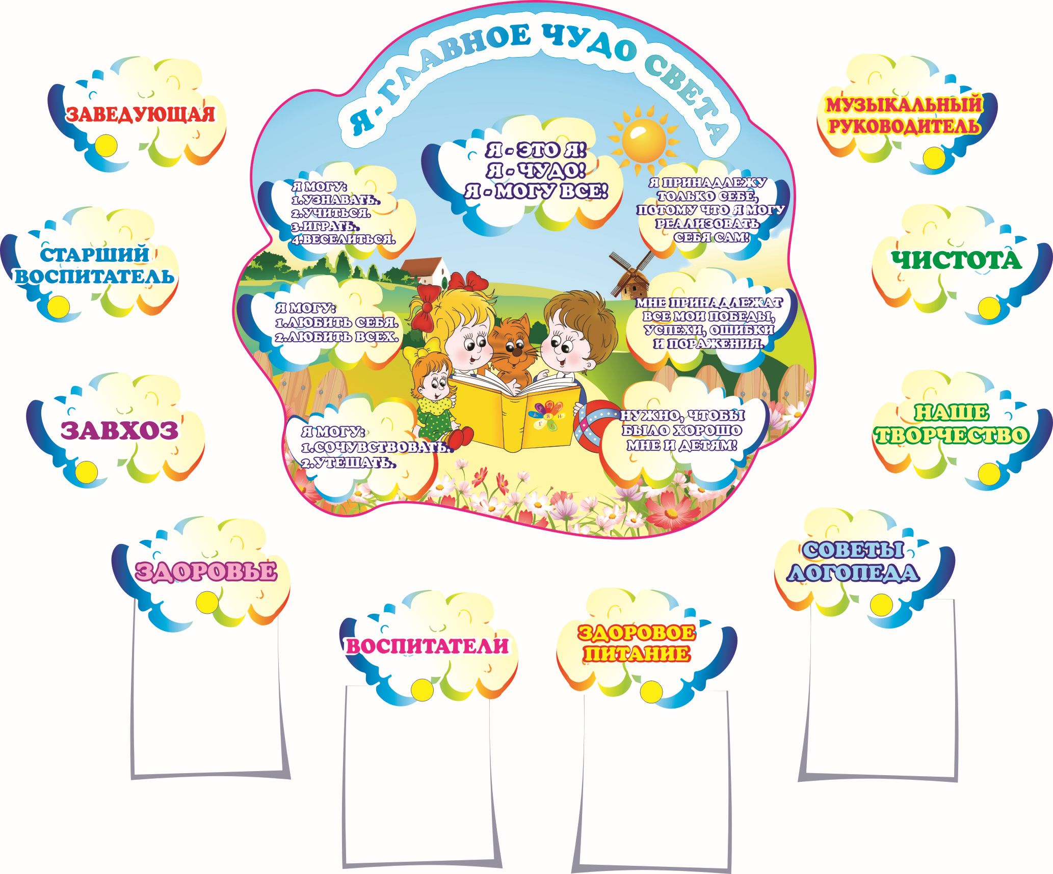 Универсальная композиция с магнитными точками, которая позволяет размещать информацию для детей и их родителей, которая касается всех сфер жизни воспитанников в детском саду.