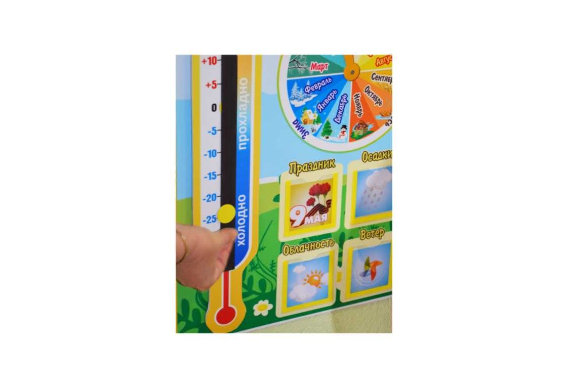 С его помощью дети смогут отслеживать времена года, текущий день недели, месяц и год, а также погоду и температуру воздуха. Специально для этого в комплект входят 7 групп плашек, которые в процессе занятия вставляются в соответствующие кармашки.
