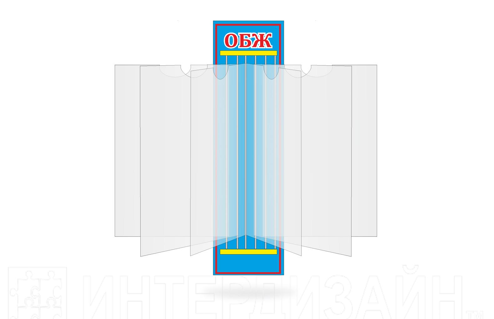 Стенд изготовлен из пластика ПВХ толщиной 3 мм. Изображение наносится на пленку или непосредственно на пластик методом полноцветной печати. Стенд включает 6 ПЭТ-карманов для листов формата А4.