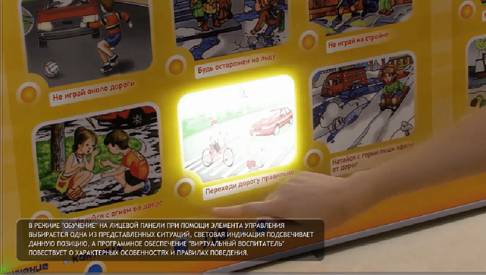 В оборудование внедрен комплект Виртуальный воспитатель, который повествует об особенностях и правилах поведения. При этом есть два возможных режима "Обучение" и "Контроль".