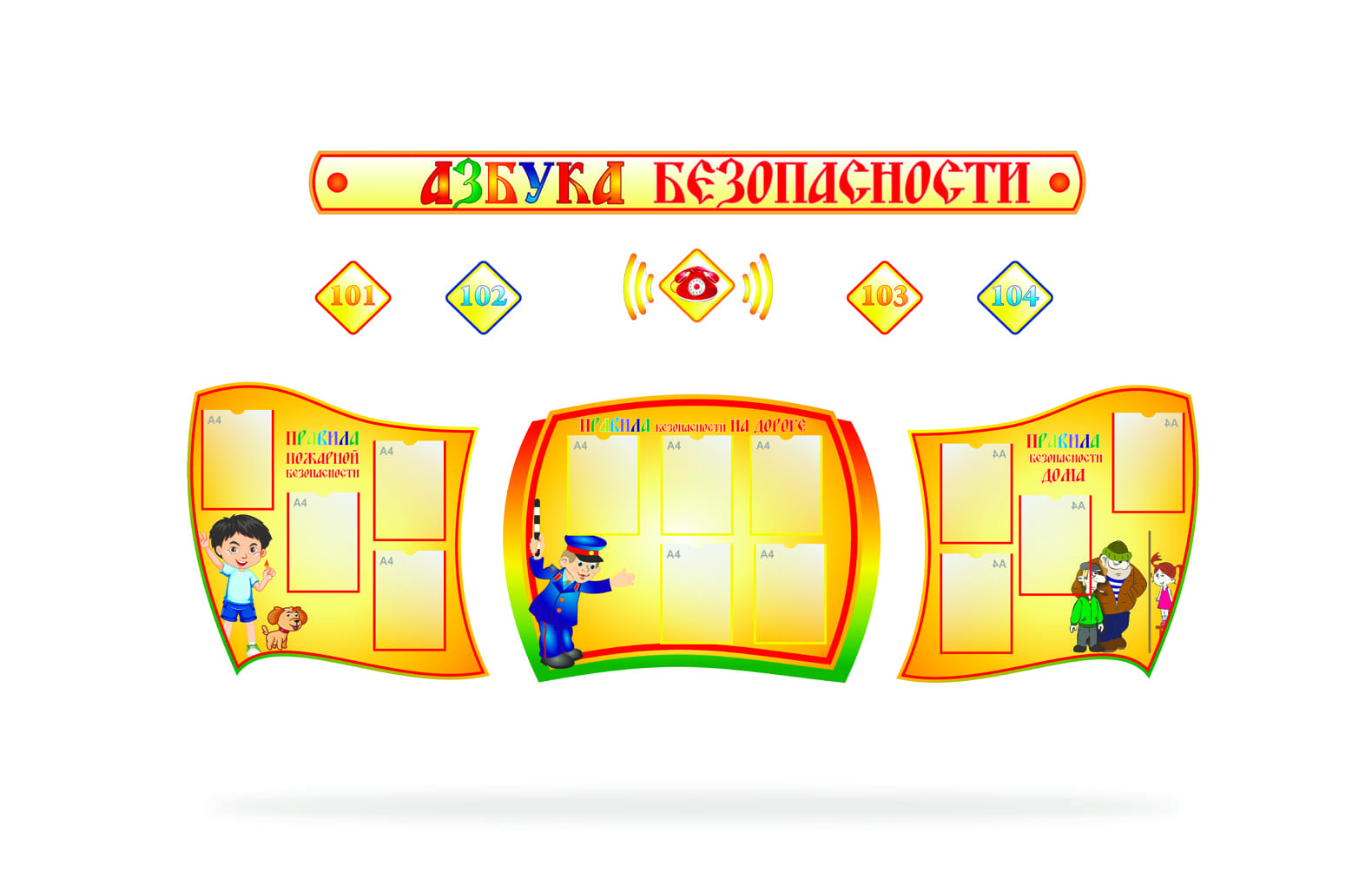 Размер:общий 350х302 см, стенд азбука безопасности 240х19.5 см, стенд правила пожарной безопасности- 93х91 см, стенд правила безопасности на дороге-111х89 см, стенд правила безопасности дома- 93х91 см, номера экстренных служб- 23х22 см, звук - 9х20 см, наклейка на дороге- 350х110 см