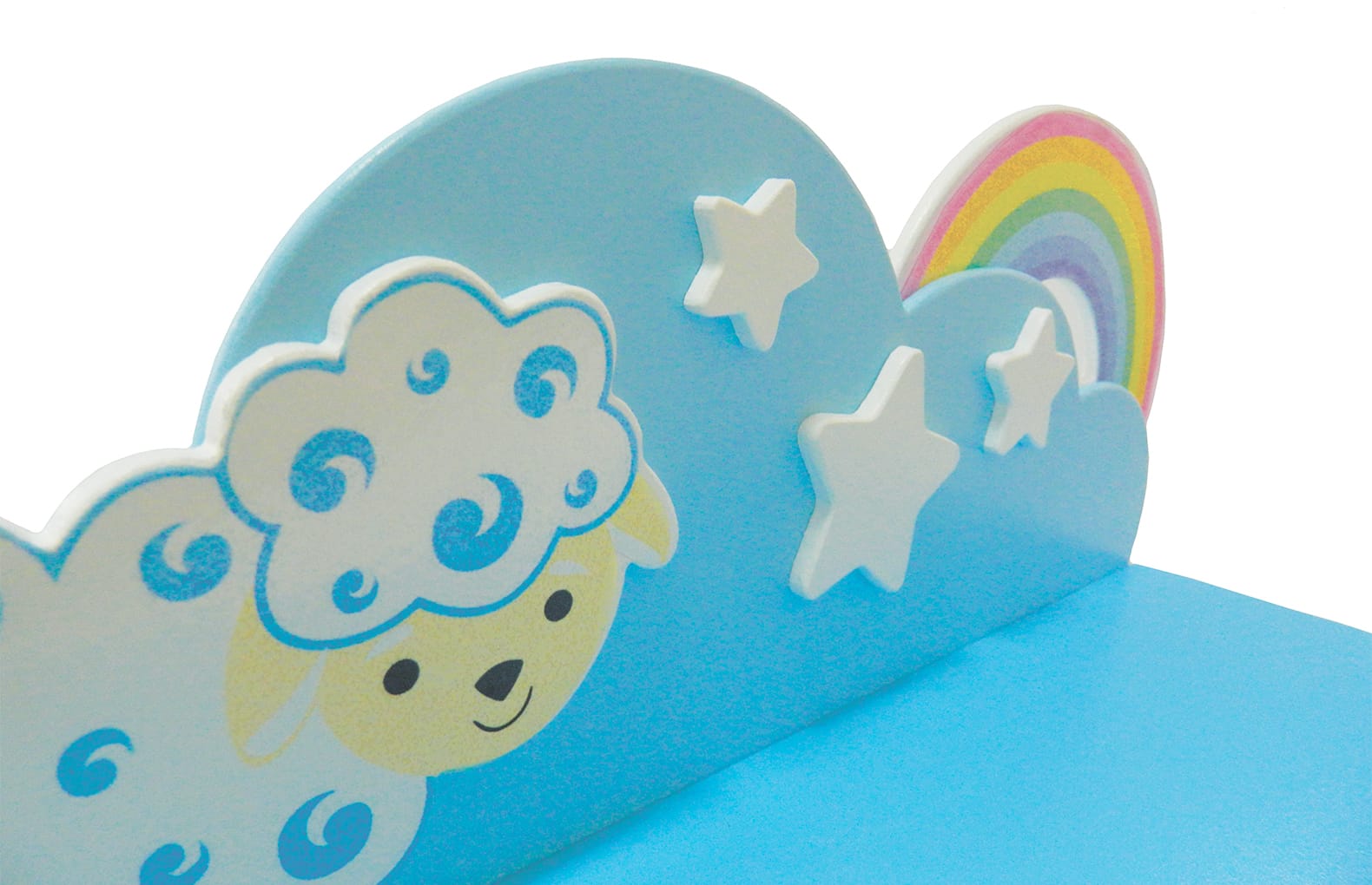 Приятные голубые и белые тона создают атмосферу спокойствия и уюта, а радуга делает детский интерьер сказочным.
