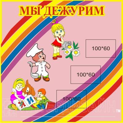 Стенд изготовлен из пластика ПВХ толщиной 3 мм. Изображение наносится на пленку или непосредственно на пластик. Дополнительно стенд оборудован "карманами", в которые можно раскладывать карточки с персональными картинками детей по видам дежурства, а также объемным "карманом" для хранения карточек всех детей группы. "Карманы" изготовлены из прозрачного ПВХ толщиной 0,5 мм и надежно закреплены на стенде. Глубина объемного "кармана" 15 мм.