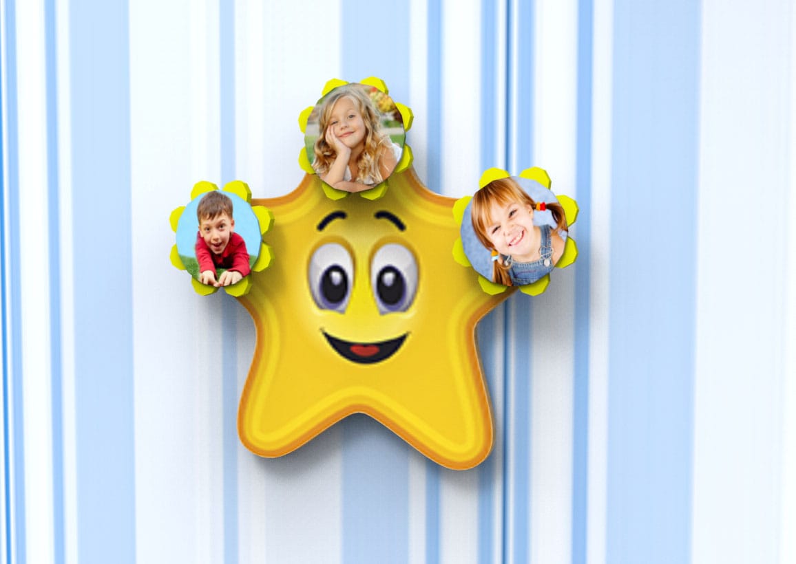 Фотография ребенка клеится на магнит "Ромашка" с помощью двустороннего скотча, который идет в комплекте.