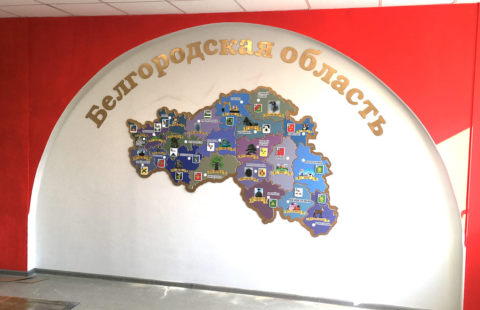 Материал:МДФ 6 мм , покраска золотой металлизированной краской Карта из2 х частей- Подложка - МДФ 6 мм -контур покраска металлизированной краской, районы цельным куском ПВХ 3 мм с печатью