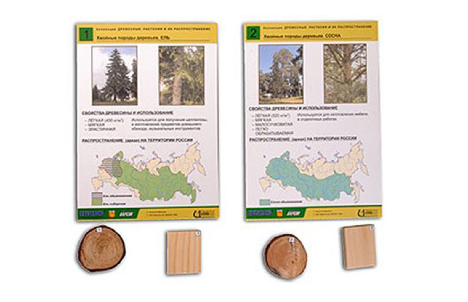 Натуральные материалы сопровождают 8 полноцветных листов (формат А4). На листах представлены фотографии растений (общий вид и ствол), приведена информация об основных свойствах древесины указанных пород (плотность дана для сухой древесины) и использовании древесины каждой породы в народном хозяйстве, приведены карты с указанием ареала произрастания.