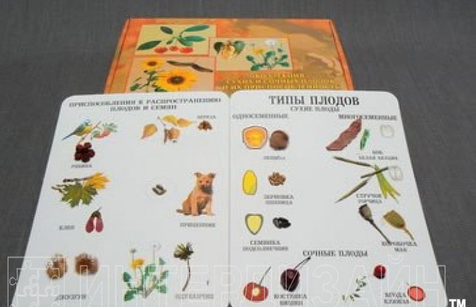 На одном планшете представлены: сухие плоды (односемянные и многосемянные) и сочные плоды (вишня, клюква). На другом планшете представлены рисунки и натуральные объекты, характеризующие приспособленность семян и плодов к распространению: ветром, птицами, животными, перекатыванием по земле.