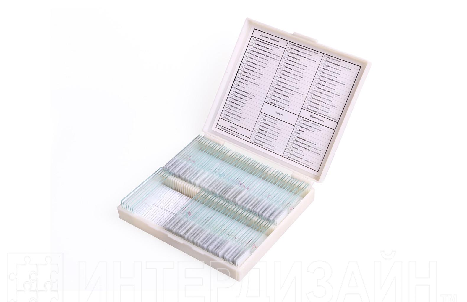 Перечень микропрепаратов, входящих в комплект: пыльник - 10 шт., лубяные волокна льна - 10 шт., кожица лука - 10 шт., поперечный срез листа фикуса - 10 шт., эпидермис листа герани - 10 шт., лист мха сфагнума - 10 шт., кончик корня с корневым чехликом - 10 шт., поперечный срез стебля клевера - 10 шт., поперечный срез стебля липы - 10 шт., завязь и семяпочка - 5 шт., поперечный срез стебля купены - 5 шт.