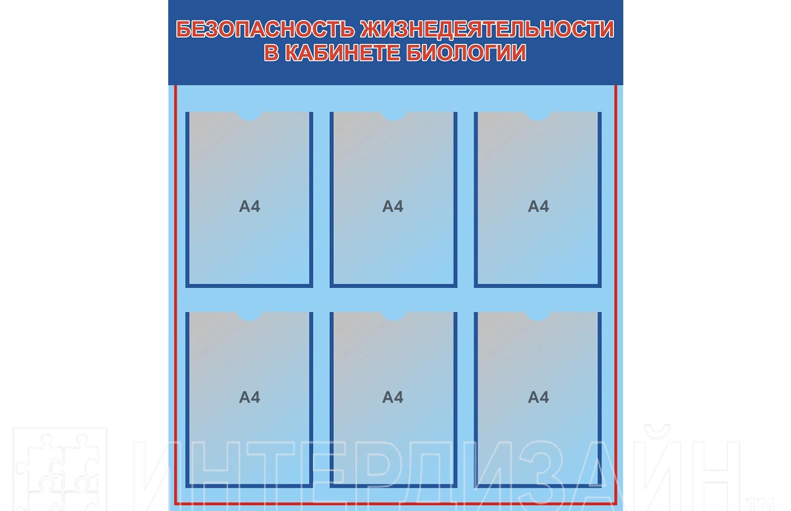 Стенд для оформления кабинета биологии - безопасность жизнедеятельности. Размещается информация на листах формата А4 в специальных карманах. Важная информация для учеников, различные советы и рекомендации по безопасности жизнедеятельности на уроке биологии.