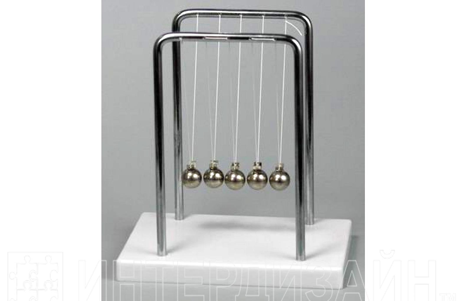 Прибор состоит из основания и двух рамок, образованных вертикальными стойками и горизонтальными стержнями, к которым на нитях подвешены пять шаров разной массы. Прибор демонстрирует взаимодействие пяти упругих шаров, подвешенных на нитях так, что в состоянии покоя шары касаются друг друга.