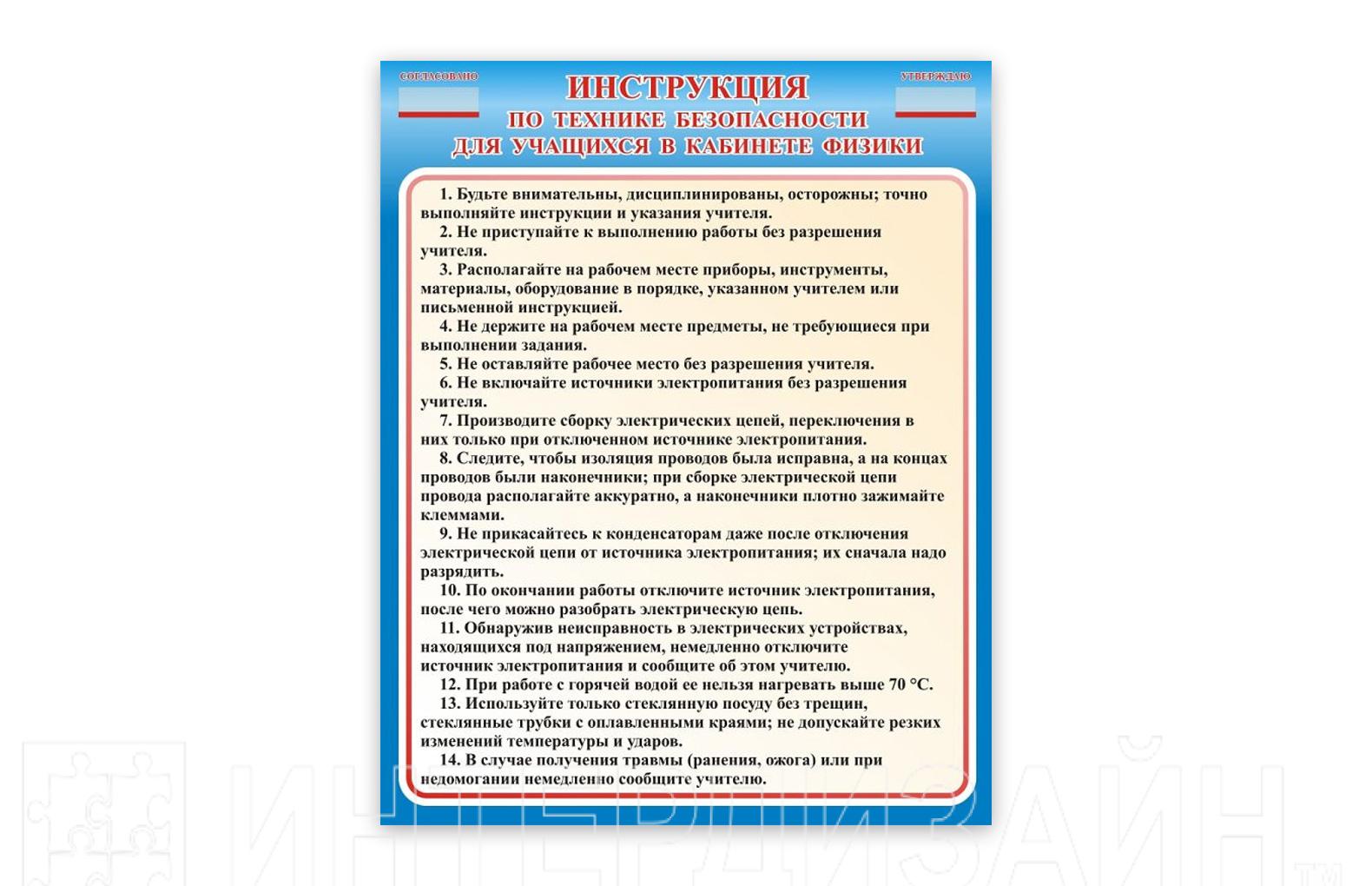 Стенд Инструкция по технике безопасности рассказывает о правилах поведения и безопасности на уроке физики. Стенд для школы входит в полный комплект для оформления классного кабинета физики, может приобретаться отдельно от всего комплекта.