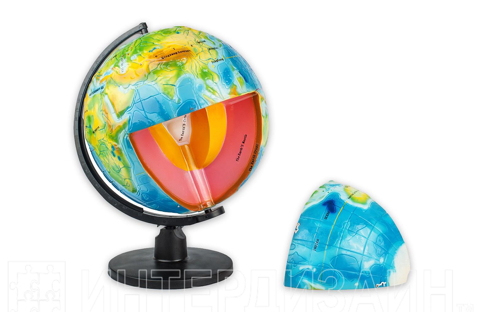 Пособие предназначено для демонстрации при изучении курса географии, природоведения в начальной и средней школе. Представляет собой рельефный глобус Земли, одна восьмая часть которого съемная, позволяет продемонстрировать внутреннее строение земного шара: ядро, мантию, земную кору.