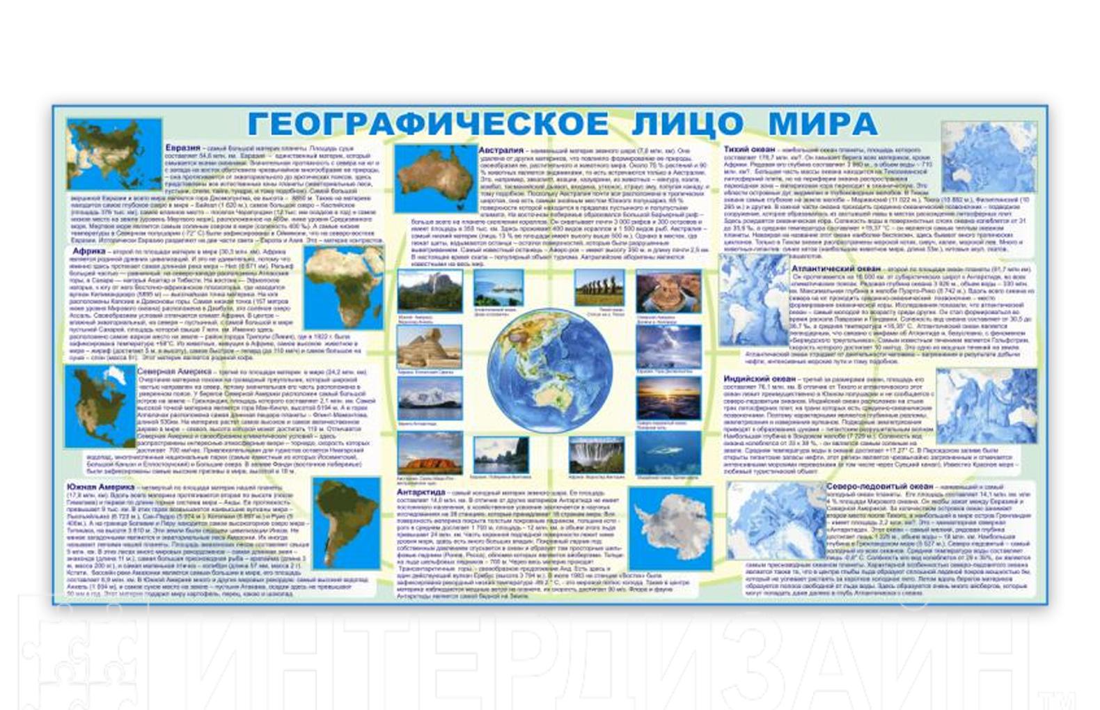 Стенд географическое лицо мира представляет собой информационный стенд по описанию различных материков и океанов с фотографиями. Входит в полный комплект оформления школьного кабинета по географии, может приобретаться отдельно от остального комплекта. Состоит из трех частей.