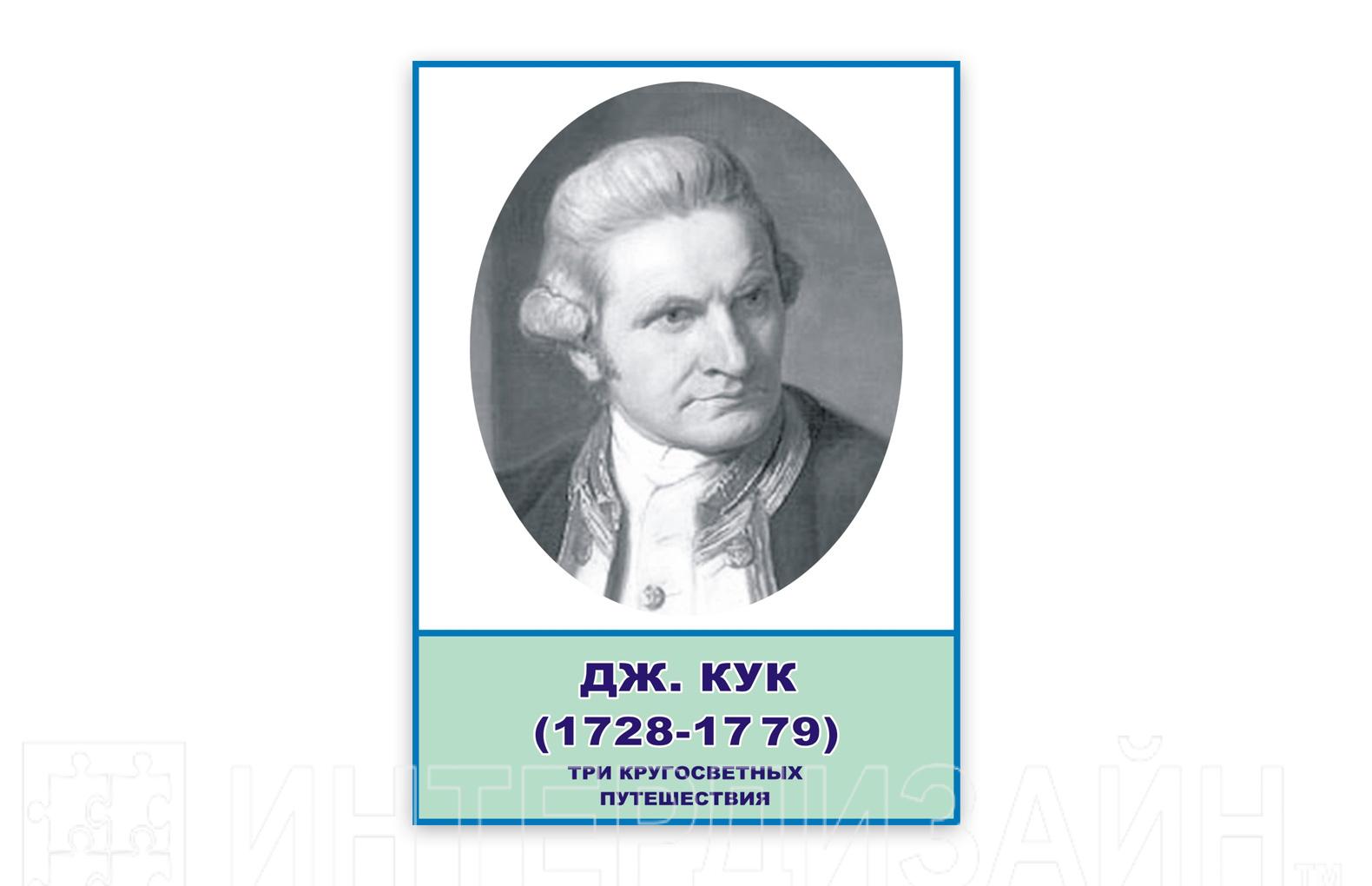 Стенд портрет Дж. Кук для оформления уголка исторических личнойтей в кабинете географии. Входит в полный комплект по оформлению школьного кабинета географии, может приобретаться отдельно от комплекта.